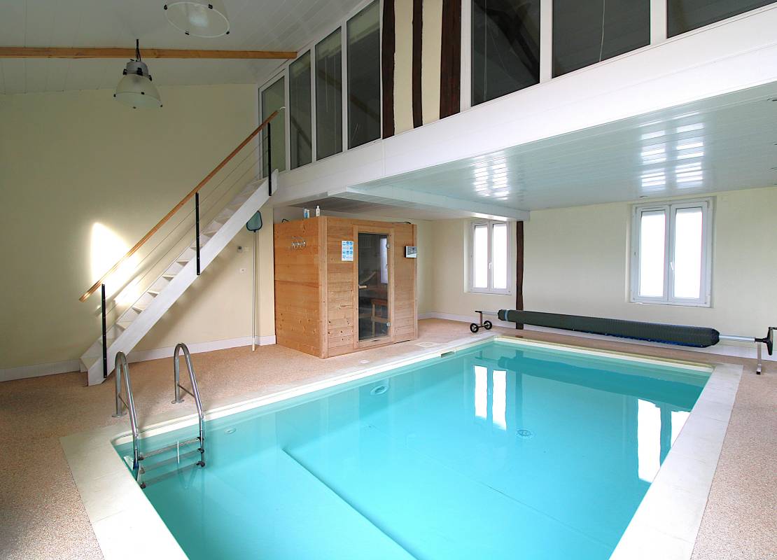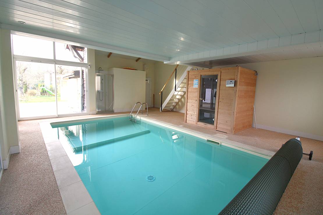 La seconde partie, anciennement dépendance, a été aménagée en un véritable espace bien-être. Elle se compose d'une grande pièce lumineuse avec piscine intérieure chauffée (skimmer et liner neufs) offrant une vue sur le jardin arboré, d'un sauna, d'une douche à l'italienne, d'un WC et d'un local technique. À l'étage, un spacieux dortoir d'environ 30 m² vient parfaire cet ensemble.