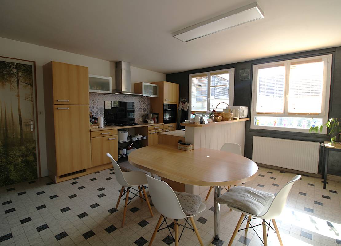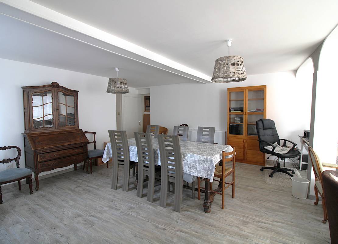 Ce bien de 169m² comprend au rez-de-chaussée : une entrée, une grande cuisine aménagée et équipée (refaite en 2012), un salon lumineux de 47m², une salle de bain et un WC indépendant.